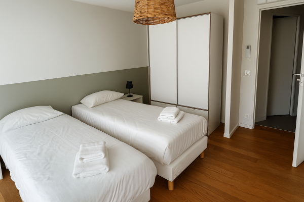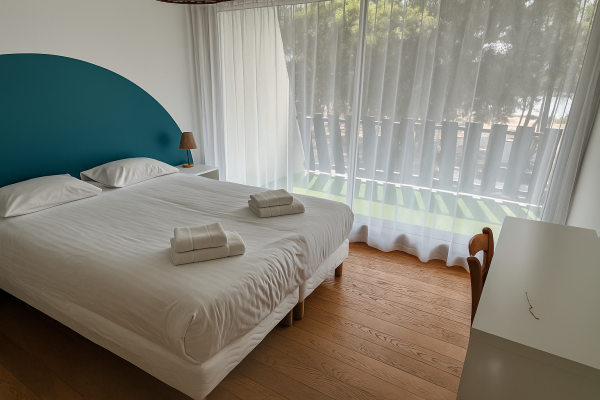 Ideal for your family stays, this spacious and comfortable suite consists of two bedrooms: one with a 160x200 double bed and the other with two 80cm single beds.